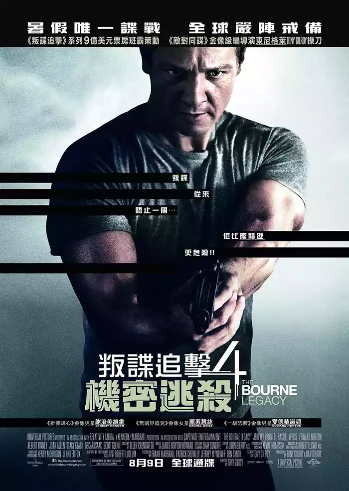 电影叛谍追击4:机密逃杀/谍影重重4/神鬼认证4/The Bourne Legacy/谍影重重4:伯恩的遗产粤语配音版全集下载,粤配版+中文字幕,1080P高清MKV格式。